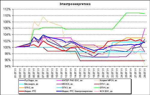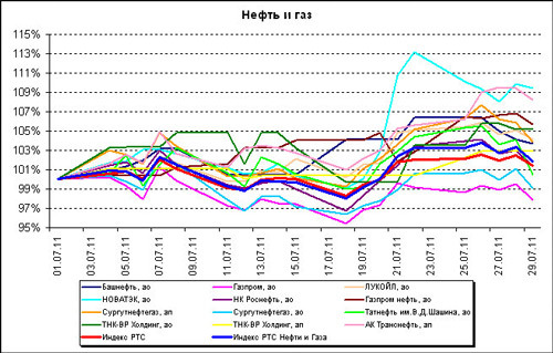 Акции «Газпром нефти» поднялись за июль на 5,67%, «Транснефти» — на 9,77%, «Башнефти» — на 3,65%, ЛУКОЙЛа — на 5,17%, «Татнефти» — на 3,8%, обыкновенные акции «ТНК-BP Холдинг» — на 5,16%, префы ТНК-BP — на 2,94%, префы «Сургутнефтегаза» — на 2,98%, а его обыкновенные акции — на 1,25%. Акции «Газпрома» за июль потеряли более 1% стоимости.