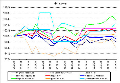 Также довольно слабый рост по сравнению с другими секторами показал за июль финансовый сектор. Индекс РТС Финансы вырос всего на 1,3%. Обыкновенные акции Сбербанка поднялись на 2,73%, префы подорожали более чем на 10%. Акции банка ВТБ потеряли в цене 2,27%.