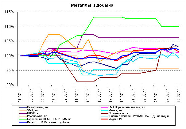 Индекс РТС Металлов и добычи вырос за июль на 2,68%; интересно, что на ММВБ этот сектор стал аутсайдером месяца, потеряв более 1%. «Причиной падения сектора металлургии стало снижение акций «Мечел», НЛМК, ММК, ТМК, — отмечает Виталий Манжос из «Норд-Капитала». — Характерной особенностью сталелитейных компаний является синхронное движение. В этом месяце производители стали снижались».