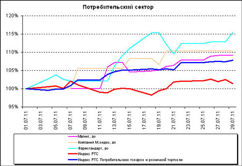 Наибольший рост показали бумаги компаний из сектора потребительских товаров и розничной торговли: соответствующий отраслевой индикатор РТС вырос за месяц почти на 8%. А «Фармстандарт» стал лидером роста среди акций из расчетного списка индекса РТС, выстрелив за июль на 20%.
