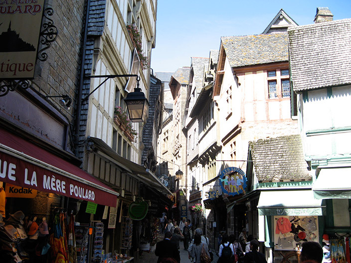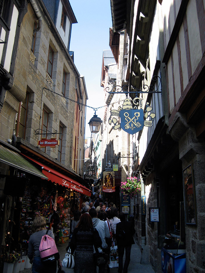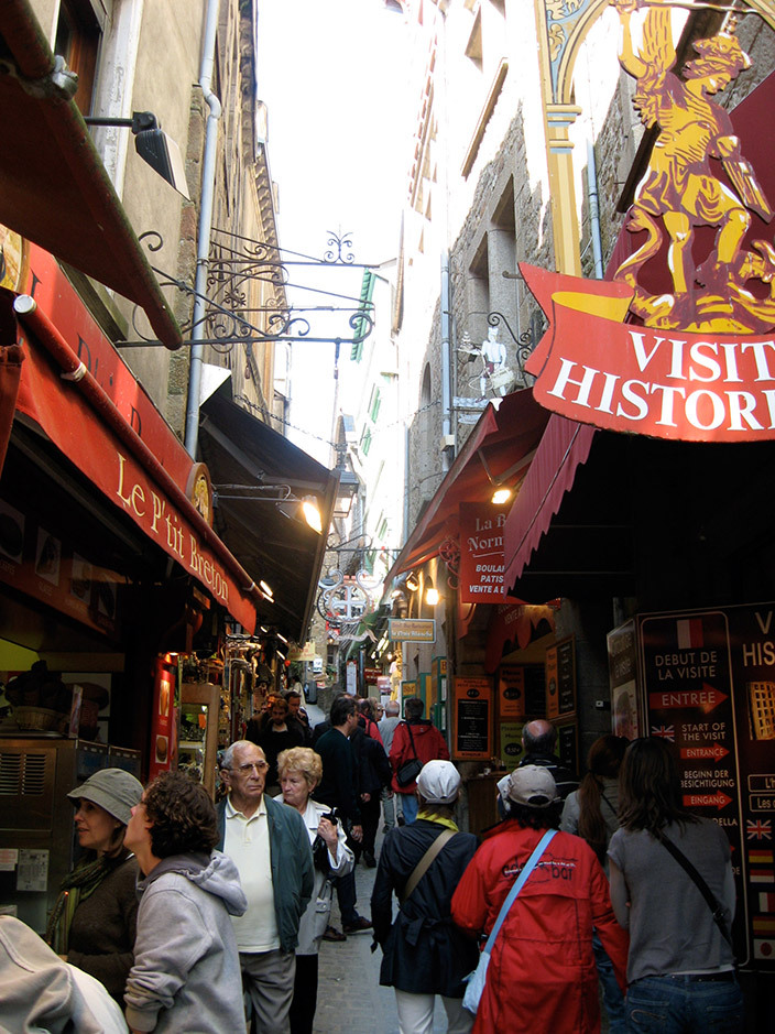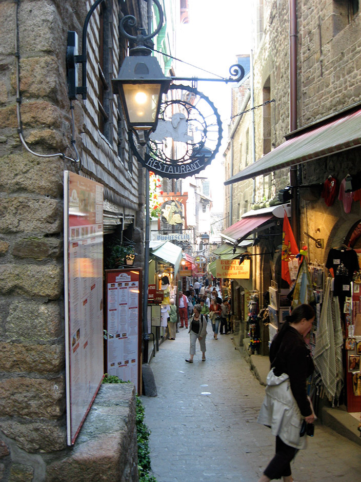 В средневековых постройках расположились сувенирные лавки с пластиковыми мечами и доспехами «мейд ин Чайна», хрусталем от Сваровски, косметикой, фастфудом и бутылками с кальвадосом. Последний, кстати, культовый напиток в Нормандии.