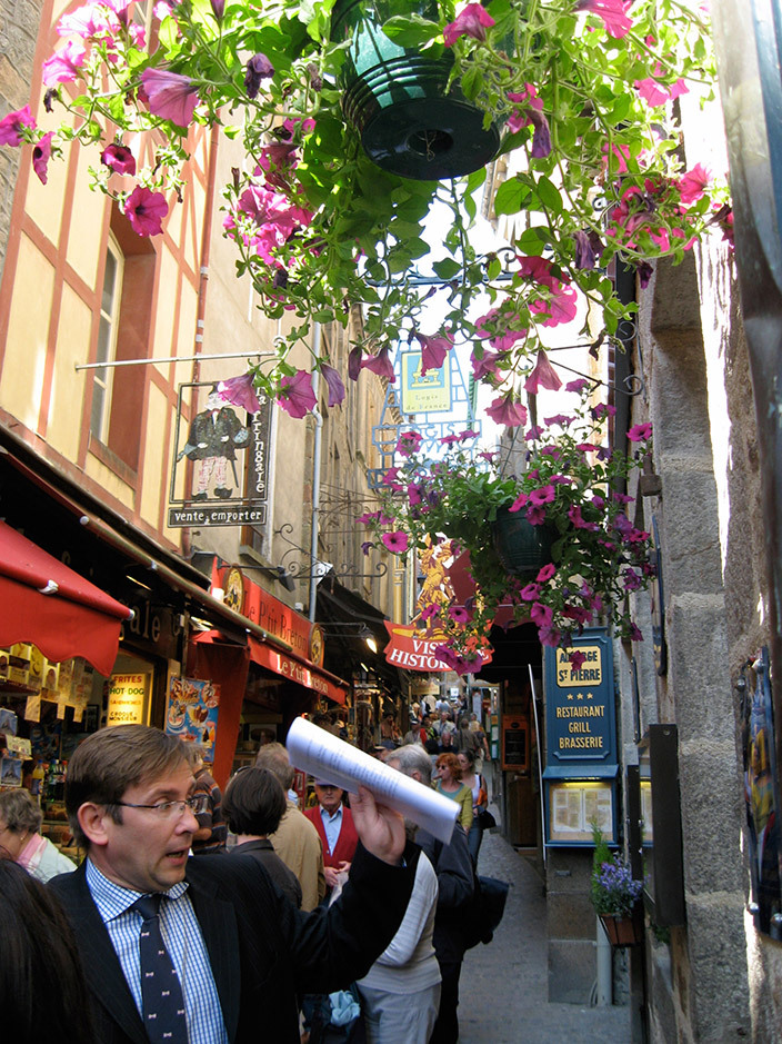 Без носильщиков, людей древнейшей профессии, не обойтись: в узкие улочки не впишется ни один автомобиль, вот они и доставляют грузы и выносят мусор. Улицы словно змеи ползут вверх, упираясь в массивные каменные ступени аббатства XI века, великий образец средневекового французского укреплённого монастыря.