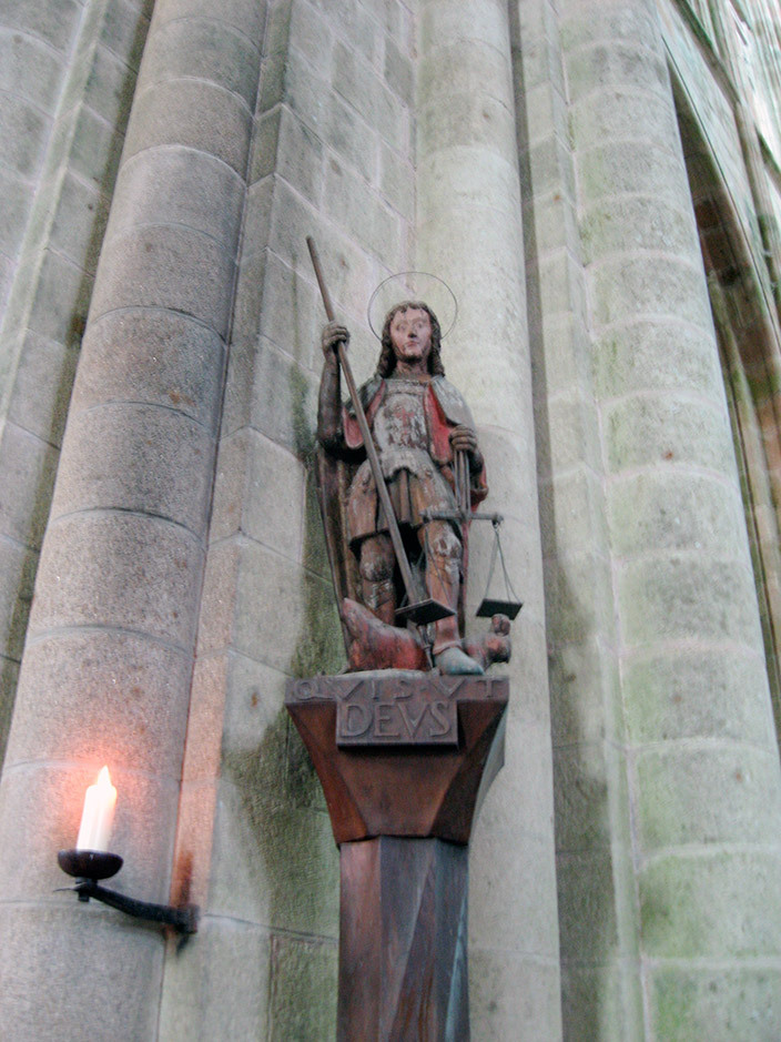 По преданию тут завершилось библейское сражение архангела Михаила с сатаной. Архангел, конечно, победил. А еще по легенде, в 708 году Михаил явился епископу Авранша и велел построить на скале церковь. Епископ долго не верил в чудо, так что архангелу пришлось прожечь ему перстом дырку в голове. Она даже сохранилась на черепе, найденном в склепе епископа.