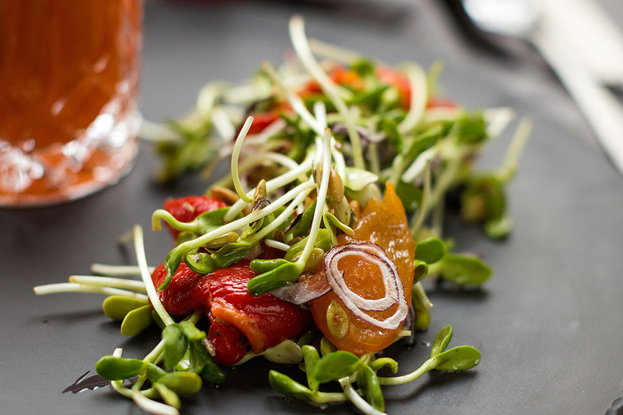 По соседству в Beer&Brut — картофель всему голова: его копченым снаряжают в салат с белыми грибами и запекают с овощами и луковым песто. Сразу после стоит пробовать картофельную зразу с грибами, которая прибывает на стол в форме эскимо на палочке пронзительного зеленого цвета, и благодарить товарища шефа за наше счастливое настоящее и весну в сердце. Из других не менее аппетитных постных творений — салат с томатами, авокадо и орзо, бабагануш с горячей питой, адресованный любителям тонкого Востока, крем-суп из цветной капусты на кокосовом молоке, лапша из лесных грибов, вареники с красной фасолью и вневременной хит гастропаба — пицца с печеными овощами.