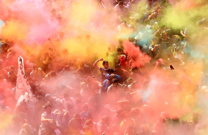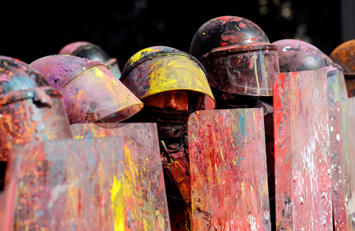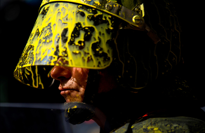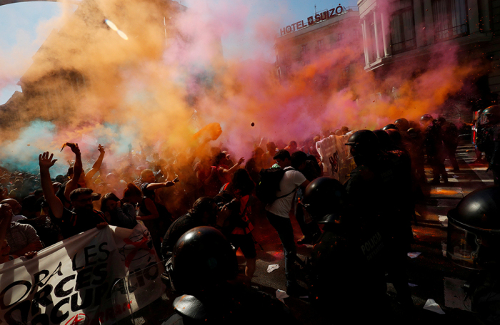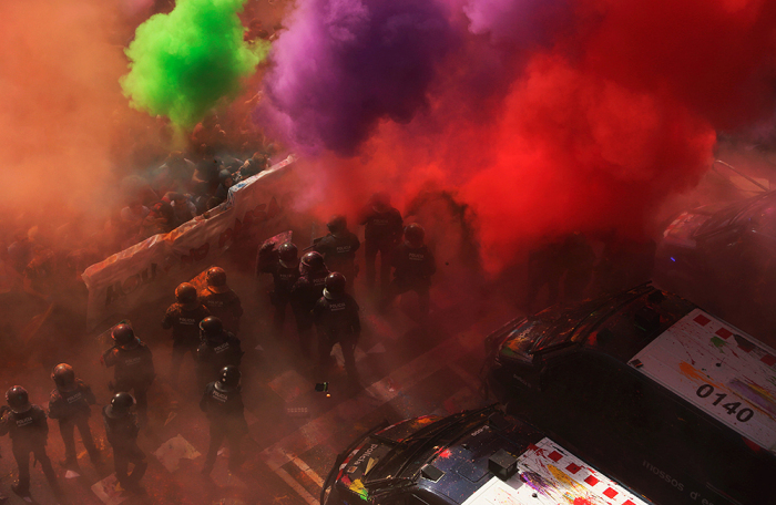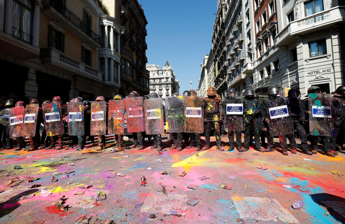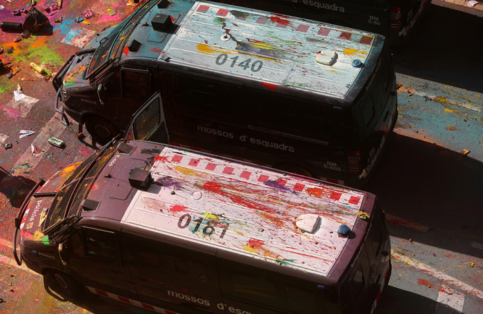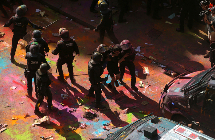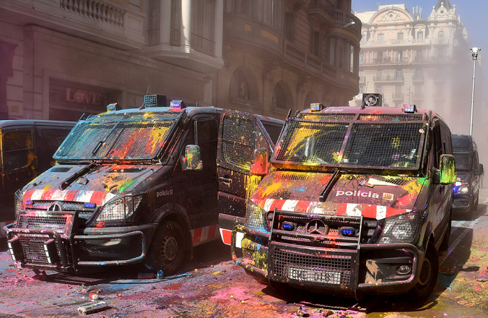 В Барселоне толпа забросала разноцветными красками полицейских, вышедших на парад. Эти кадры показал испанский телеканал «24 часа». Шествие силовиков проходило в поддержку действий полиции на признанном незаконным референдуме о независимости Каталонии.
