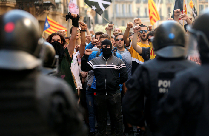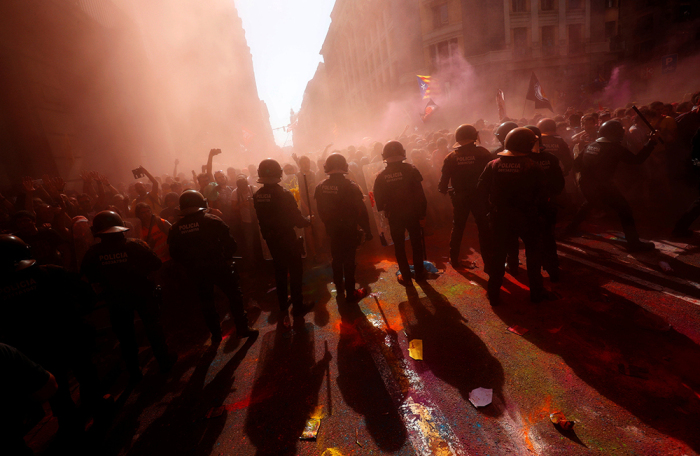 Стражи порядка вышли на шествие в поддержку действий полиции во время проведения референдума о признании независимости Каталонии. Сторонники отделения от Испании забросали их красками. Начались беспорядки