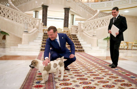 Бердымухамедова щенка породы пятнистый алабай. Щенок сразу подошел к Медведеву и лег в ногах. Турецкий лидер, в свою очередь, заметил, что собака «нашла хозяина».