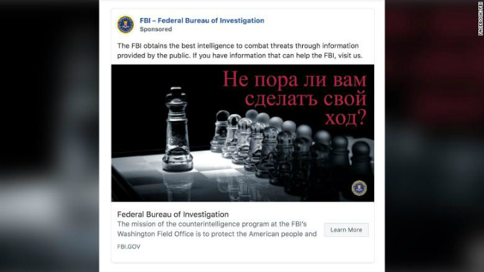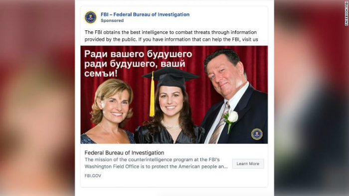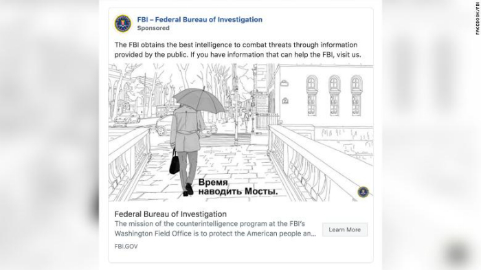 ФБР размещает в Facebook три рекламных баннера с обращениями на русском языке, сообщает СNN. К иллюстрации, где мужчина идет по мосту, подпись «Время наводить Мосты», причем последнее слово с большой буквы.