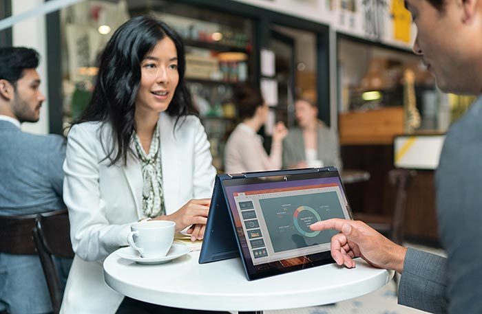 Необычно выглядит и экран: производитель сделал рамки практически незаметными, а полезную площадь экрана — максимальной. Дисплей очень яркий и контрастный, не «слепнет» при любом освещении и обеспечивает четкое изображение. Что интересно — экран ноутбука сенсорный. Он поддерживает как управление жестами, так и работу со стилусом. В HP создали решение, востребованное для деловых задач: легким движением рабочий ноутбук превращается в планшет. Крышка разворачивается на 360 градусов.