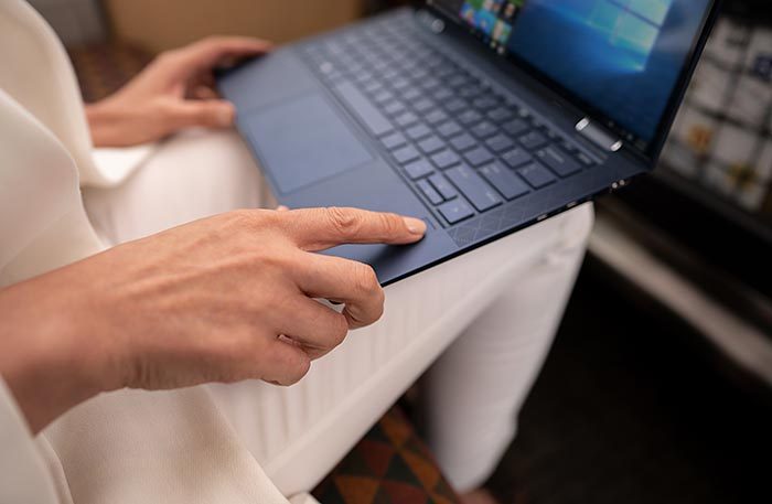 Первое, что цепляет при взгляде на ноутбук, — это дизайн. При всей лаконичности есть в нем что-то необычное, заставляющее внимательнее присмотреться. Возможно, дело в цвете — Dragonfly Blue. Спокойный синий цвет едва заметно переливается, при этом поверхность ноутбука матовая. Благодаря специальному покрытию на крышке практически не остается отпечатков — это важная деталь, заметно влияющая на вид устройства.