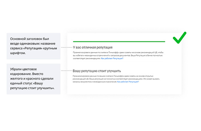 В ходе пилотного проекта «Тинькофф» максимально упростил навигацию, поставил крупные наглядные цифры, сделал цветовое кодирование. Но первый блин вышел комом. Пользователи восприняли «Репутацию» совсем не так, как планировалось.