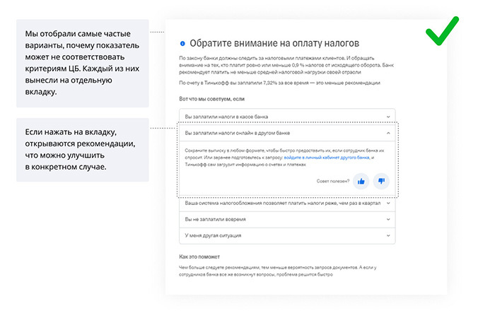 Для банка было очевидно, что если показатели отклонились от нормы, на это надо реагировать. Допустим, клиент увидел, что заплатил мало налогов, и дальше сам разберется, что с этим делать. На практике оказалось, что это не так. А вот конкретные рекомендации работают хорошо. Например, если банк обратил внимание на то, что предприниматель заплатил мало налогов, клиенту предлагают выбрать из списка пункт, объясняющий это. Допустим, клиент заплатил налоги со счета в другом банке, поэтому «Тинькофф» не видит этого. В таком случае он может загрузить выписку, и показатель придет в норму.