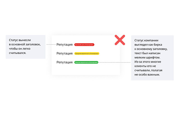 Красный цвет не означал, что клиента прямо сейчас заблокируют, а обращал внимание на высокий риск проверки. Но клиенты надпись не читали: они видели красный цвет, слово «блокировка» и в панике начинали писать в службу поддержки.
