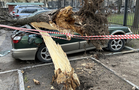 В столице уже несколько автомобилей повреждены упавшими на них деревьями, ветер валит заборы, остановки и столбы с дорожными знаками