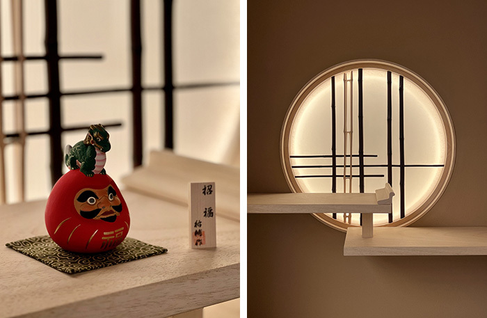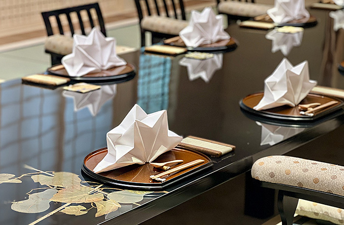 Главное украшения интерьера — темный стол на десять персон, покрытый традиционным японским лаком уруси, по углам роспись: крабы зимой, весной, летом и осенью. Стол расписывал художник из Петербурга, очень красивая музейная работа. При раскрытых окнах виден храм Знамения иконы Божией Матери на Шереметьевом дворе 1680 года постройки — редкая оставшаяся жемчужина московского (нарышкинского) барокко.