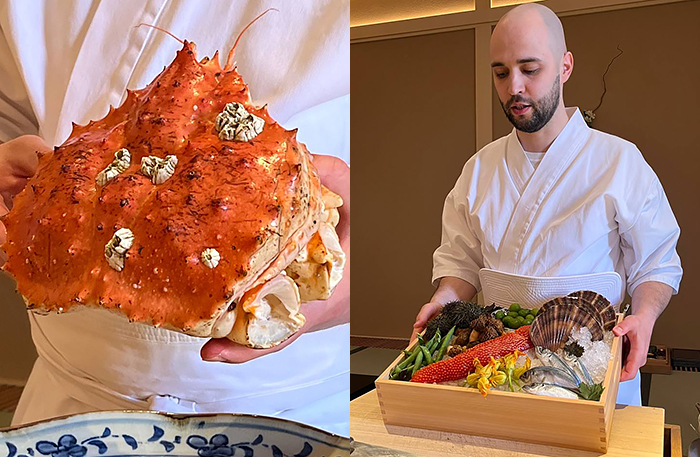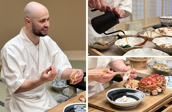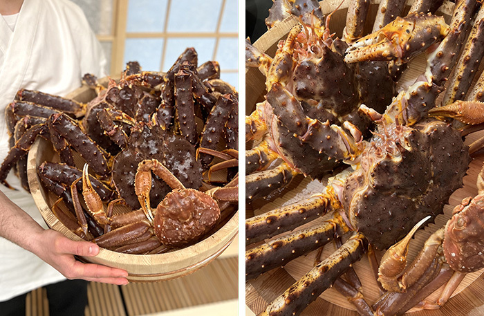 Еще одна особенность в Uchiwa — шеф готовит сидя на коленях. Не уверена, что это легче, чем стоя, особенно с учетом, что сервис идет 2,5 часа. Шеф говорит, что «привык», и тут тоже самурайская стойкость. Японцы готовят краба совсем не так, как привыкли европейцы, Константин Шкарбан следует традиции. Гости смогут попробовать вареного краба с соусом пондзу, в темаки ролле, на пару, крабовую темпуру, краба сябу-сябу — быстро сваренного в бульоне даси, краба, приготовленного на гриле хибачи, и донбури-краба с рисом.