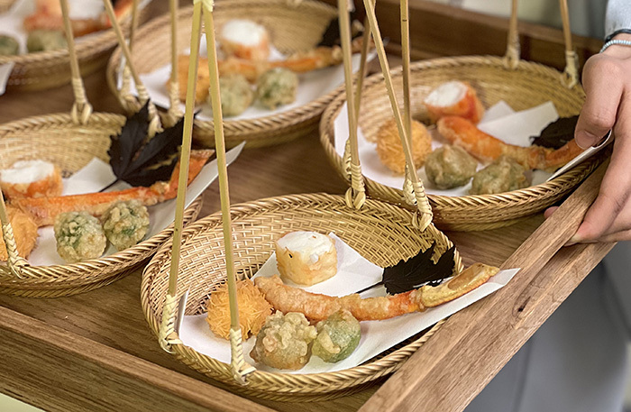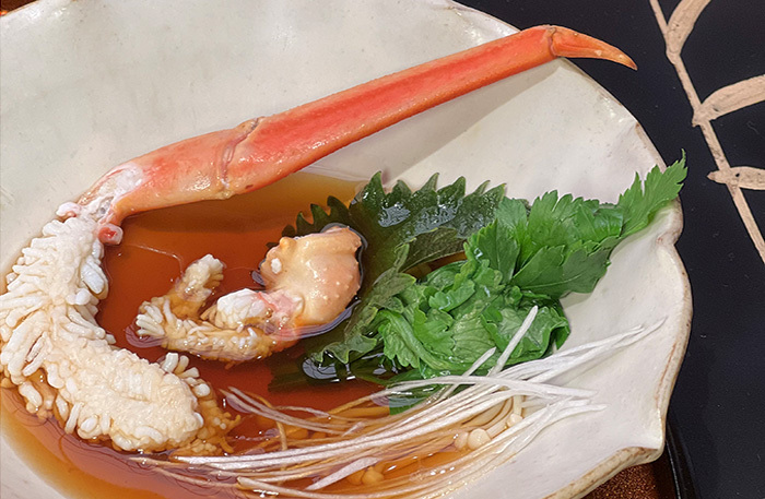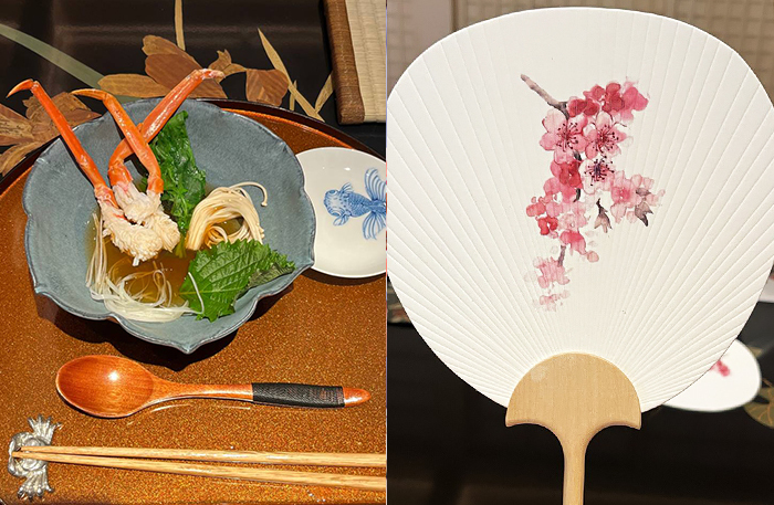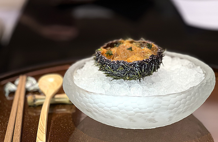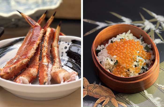 Меню Uchiwa выстроено вокруг одного главного продукта — краба, а точнее, двух его видов — королевского камчатского и стригуна-опилио. Но не переживайте, вам не придется есть 11 подач краба. Хотя краб главный, но есть бульон, морской виноград, персики вакамомо, мисо суп и даже японский омлет чаван-муши в необычной подаче. Единственное, чего нет — красного мяса. Оно появится в третьем ресторане WA Garden, Tajiri-Go.