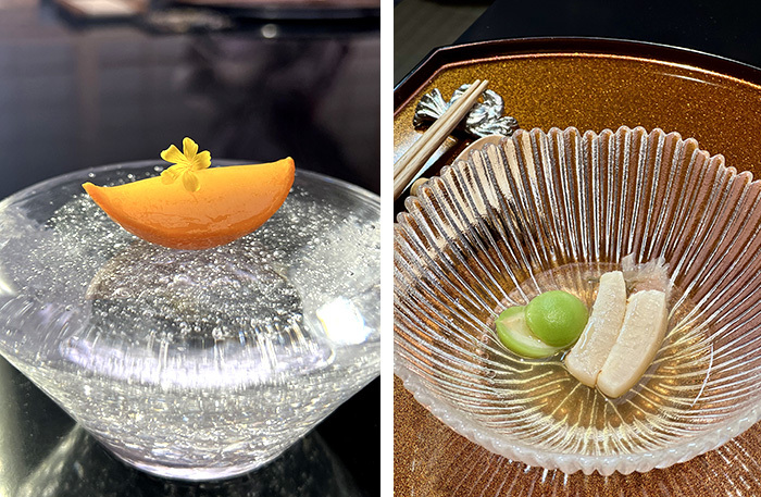Блюда мне понравились все, в каждом что-то необычное: техника, ингредиент, история. Из того, что меня поразило. Морской еж с желе и васаби — в желе присутствует рисовой уксус мерин, бульон даси, светлый соевый соус, и благодаря этому сочетанию уходит яркая, не всеми любимая йодистость ежа. Теплый гребешок в бульоне с зеленым персиком и японской травой кноме (по вкусу как перец с цитрусом), причем она выращена подмосковным фермером. Омлет тяван-муси, который подается в японской чашечке с бульоном из нибоси (роль японской сушенной рыбы исполняет крымская ставрида), сверху икура, внизу маленькие кусочки белой пекинской груши — очень необычное сочетание и форма подачи омлета. Темпура подается в соломенных корзинках с ручками, в ней, помимо краба, присутствует японский зеленый персик и цветок цукини. Разбор краба на составляющие — отдельное шоу, как увлекательный урок зоологии. И шеф раскрыл секреты, как сделать стригуна при варке «пушистым».