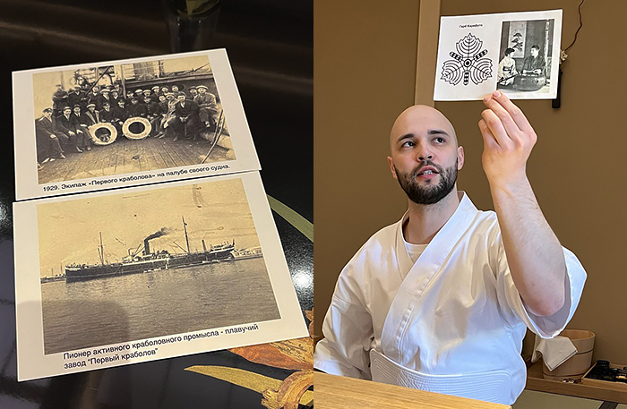 Подача омакасе научно-познавательная. Помимо состава блюд рассказывают и про добычу краба, и первый крабовый завод, и как японцы удобряли крабом огород, пока не осознали все гастрономические прелести, и про первый рекан 705 года (работает до сих пор), и про 46 поколений вежливости, и про то, как появился советский бренд Chatka, завоевавший мир.