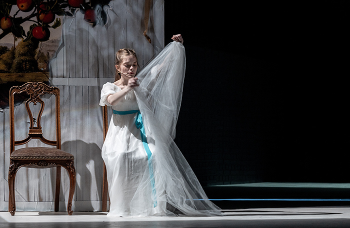 Написанные в Болдине «Повести Белкина» — легкие, ироничные литературные реминисценции, почти анекдоты, как говорят сам Гинкас и его актеры. Люди решают свою судьбу, играют жизнями, своими и чужими, у края мрачной бездны, порой счастливо избегая падения. В том числе и на гироскутерах, которые очень органично вписались в спектакль: Владимир в страшную метель пробирается на нем через лес, то ускоряясь, то падая.