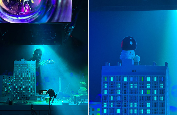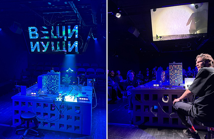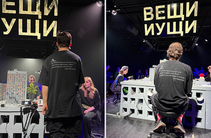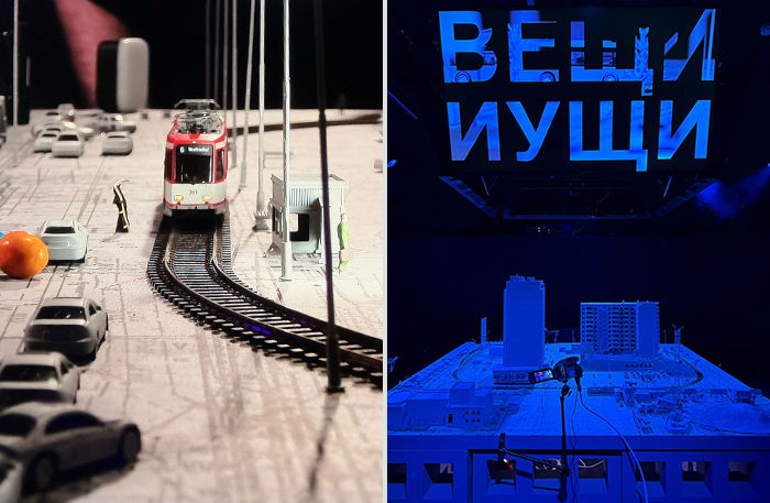 «Вещи и ущи» — инсталляционная интерактивная игра в город и горожан. В центре зала — детализированный и довольно реалистичный макет спального района: многоэтажки с горящими окнами, детские площадки, трамвай, магазин у подъезда. Внутри — миниатюрные фигурки жителей, за которыми зрители следят через экраны: актеры снимают их в реальном времени на ручную камеру, играя с масштабом. Художники — известные петербургские сценографы Мария Лукка и Александр Мохов.
