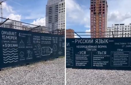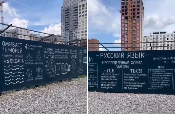 Недавно в Telegram завирусился ролик, главным «героем» которого стал строительный забор. Огораживает он стройплощадку одной из школ в Новосибирске и в полном соответствии с тематикой объекта содержит сведения по русскому языку, математике, физике, географии и так далее. Благодаря забору можно узнать (или освежить в памяти), что Россия располагается в четырех климатических и 11 часовых поясах, вспомнить подзабытые правила написания «-тся» и «-ться» или «пре-» и «при-», вычисления скорости, решения простых уравнений и так далее.