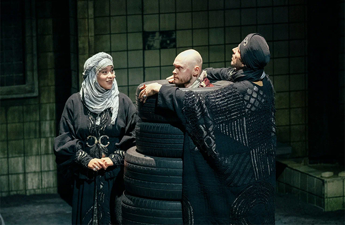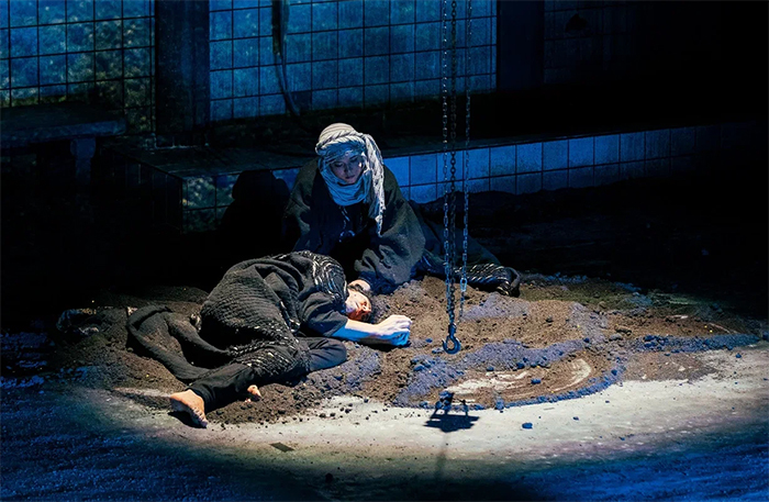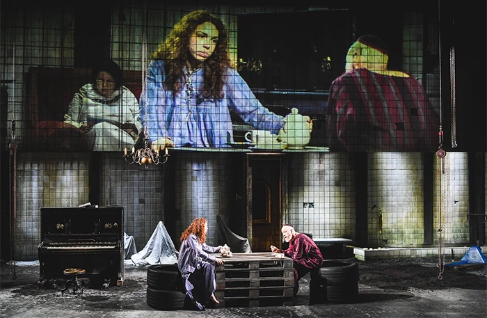 На сцене — старое пианино, люстра, валяющаяся в тележке античная фигура, холодильник, электрический чайник. Эти осколки культуры разных эпох собрались в достаточно агрессивном пространстве — в огромном цехе по переработке покрышек. Это метафора человеческой жестокости, которую люди пытаются переработать, а она все возвращается в других формах.