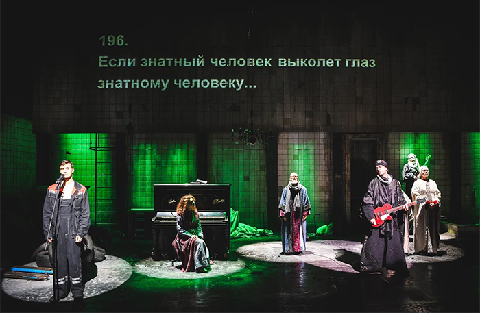 На фоне — большой проектор, на котором транслируется все происходящее на сцене. Режиссер Петр Шерешевский называет это «онлайн-кино». Композиция, крупность планов и расположение камер тщательно выверены. Все в кадре, вплоть до сантиметра, подчинено строгому режиссерскому замыслу. Петр Шерешевский «разглядывает время сквозь время» и использует классический текст как инструмент для разговора о проблемах современности: