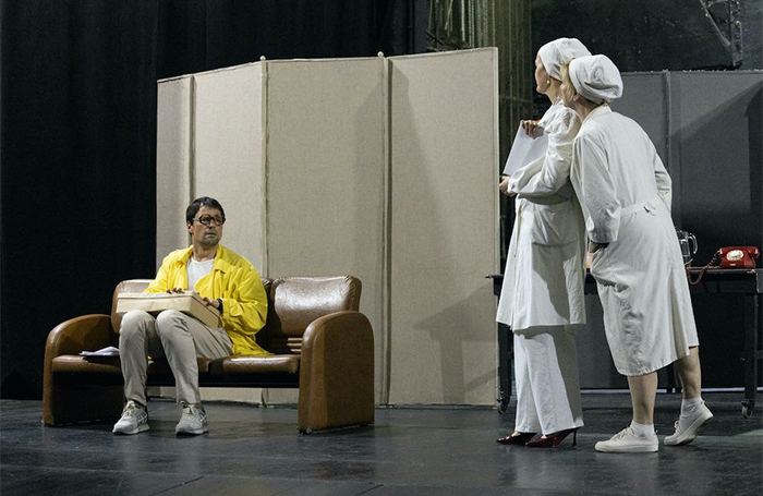 Сценография первого действия построена на узнавании. На стенах висят репродукции Шишкина и Репина, по телевизору показывают «Веселую карусель», а среди персонажей — сплошь узнаваемые типажи. Сказочный мир Чуковского здесь плавно перетекает в бытовую реальность и возвращается обратно.