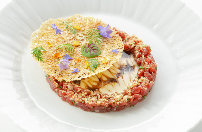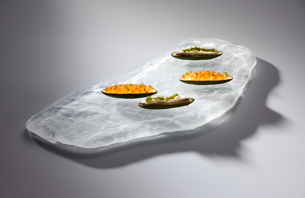 Балтийский анчоус с икрой корюшки, сервированный на оттиске стекла с набережной канала Грибоедова, фуа-гра с копченым топинамбуром и карамелизированным луком на хрустале, созданном из элементов советских телевизоров, язык ягненка с семью видами капусты на переработанной металлической посуде из старых сковородок.