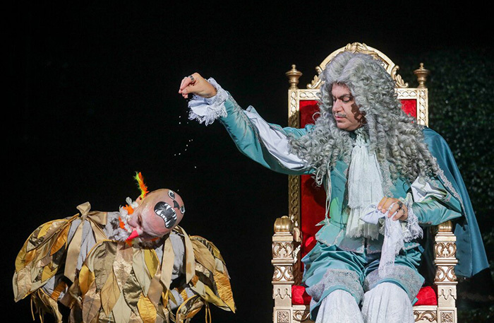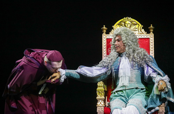 С первых же минут зрителя ошеломляет масштаб и бюджет постановки. Сценография, стремящаяся к гигантизму, с огромными золотыми головами младенцев, и роскошные, до мельчайших деталей продуманные костюмы модельера Игоря Чапурина. Да и в главных ролях — Константин Хабенский и Николай Цискаридзе, дебютирующий на драмсцене под псевдонимом Максим Николаев. Ратующий за доступность театра, он не раз называл цены в государственных институциях «ненормальными». Во время сентябрьского пресс-подхода я спросила его, что он думает о стоимости билетов на «Кабалу»: