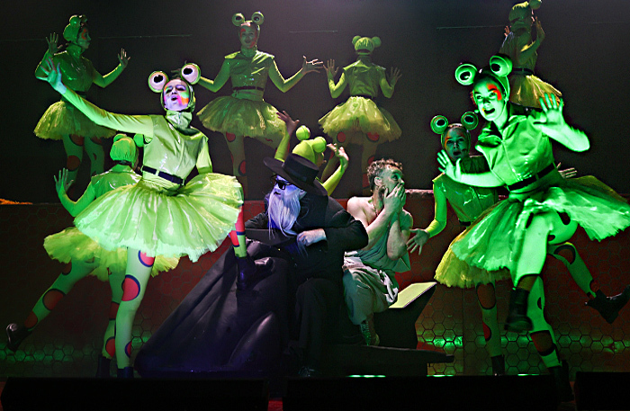В Московском Губернском театре под руководством Сергея Безрукова — премьера «Лягушки» (16+) по мотивам одноименной комедии Аристофана. Поставил молодой режиссер Василиос Самуркас, который учился в ГИТИСе в мастерской Евгения Каменьковича и Дмитрия Крымова. Получилась прекрасная неоновая история с лягушками в балетных пачках, с состязаниями поэтов и с неожиданными новыми персонажами — например, с Марией Каллас и Александром Сергеевичем Пушкиным.